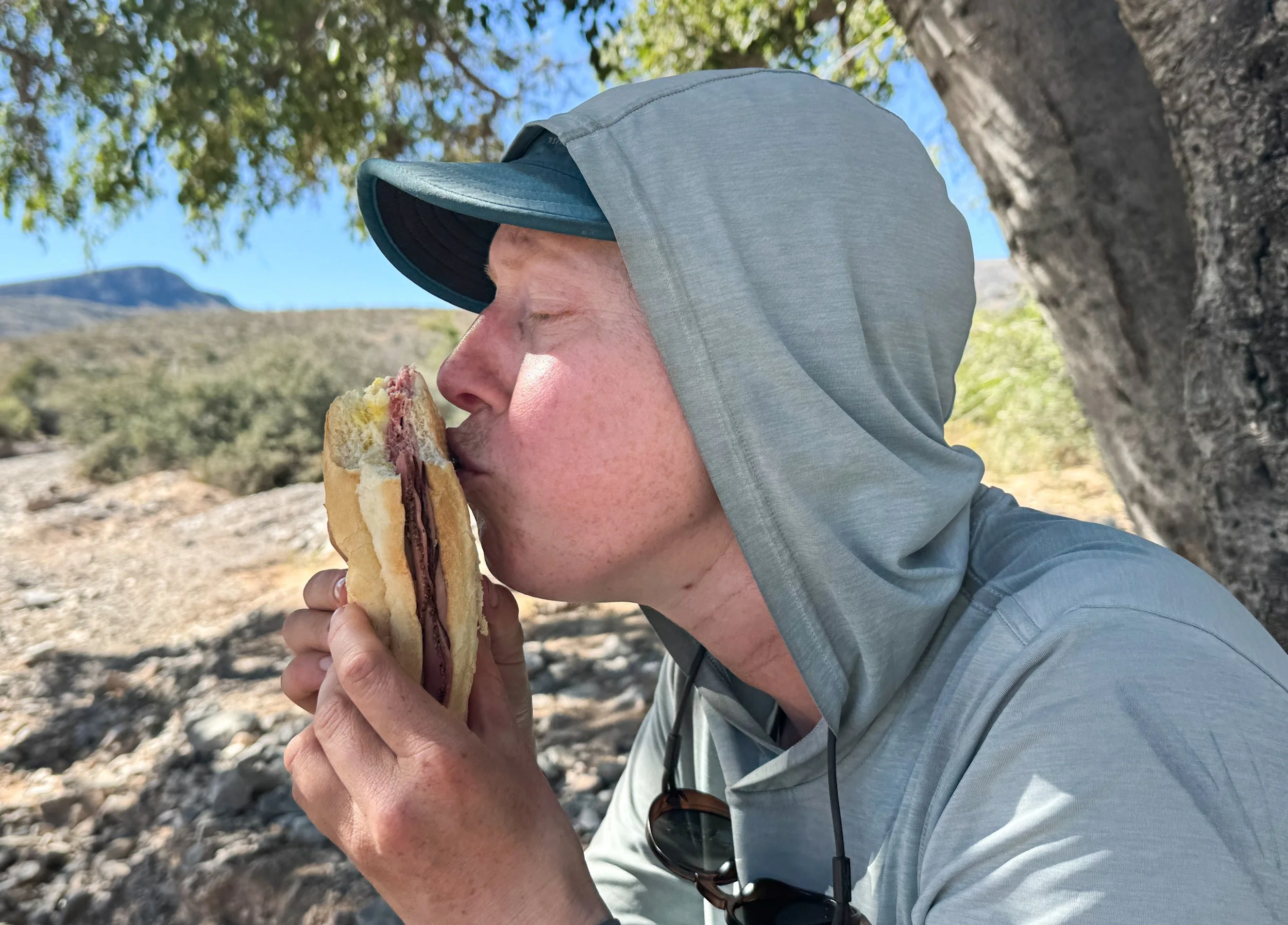 On that last day, while we were taking our customary shade break under the only tree for miles around (it literally had a waypoint on our map for “Big Tree”), an ATV pulled up with two hunters. The driver climbed out dressed in a complete head-to-toe camo combat suit and two silver-plated pistols, one on each hip. He introduced himself as Joe and asked if there was anything we needed, “Food? Water?” We both perked up at the mention of additional sustenance, and we told Joe we’d certainly accept some calories if he could spare them. He walked back around to the passenger side of the vehicle and rustled around for a moment. Then, like some sort of tactical Santa Claus, Joe emerged from behind the ATV with a sack full of clementines and an entire 18-inch long pastrami sandwich. We could have cried with joy. Before he left, Joe also handed us each a shooter of Fireball, insisting that we have something to celebrate with at the monument. We graciously accepted, and he drove off into the desert.