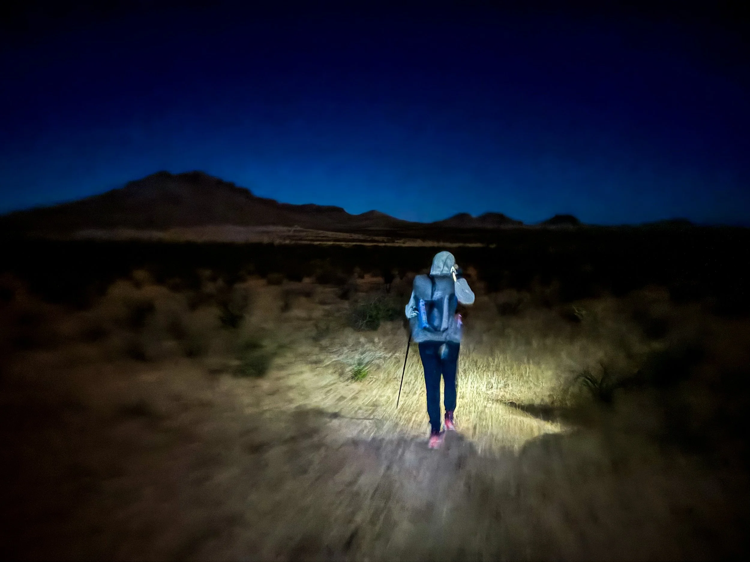It is hard to capture what it feels like to hike in the desert at night. In the forest, you feel like you’re in a tunnel with only the light from your own headlamp. In the desert, the slightest glow in the sky lets you see the skyline around you.