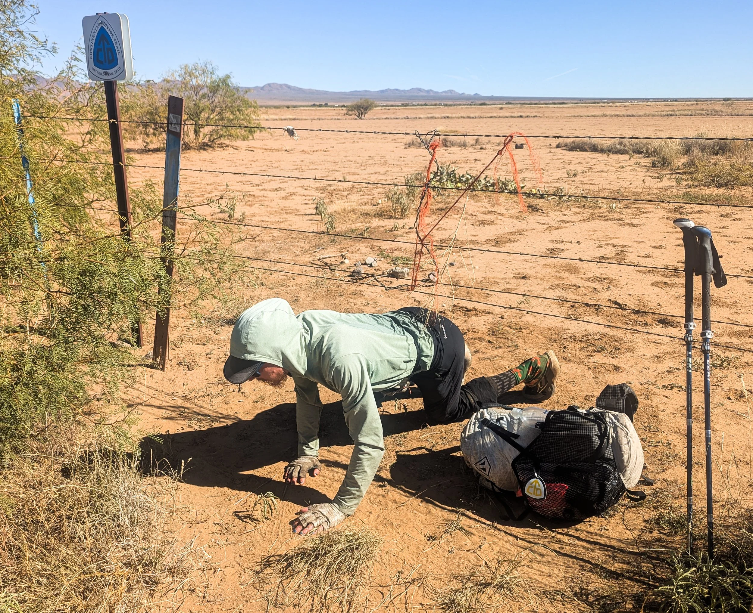 The CDT had to throw at least a little more shenanigans our way before we finished. Here’s Jonathan crawling under a fence next to the highway into Lordsburg on the official CDT.